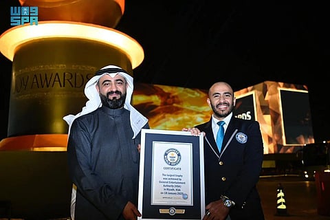 منحت موسوعة غينيس للأرقام القياسية الهيئة العامة للترفيه (GEA) وموسم الرياض ومهرجان جوي 2025 شهادة تحقيق أكبر درع تكريمي في العالم، بارتفاع بلغ 15.13 مترًا، في إنجاز جديد يُضاف إلى سجل الهيئة.