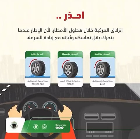 وأوضح المرور في إنفوجرافيك بحسابه بتويتر، أن سرعة المركبة تتحكم في مدى تماسك وثبات الإطارات، ويكون ذلك بشكل أكبر خلال السرعة المنخفضة، ويقل تدريجيًّا مع كل زيادة لسرعة المركبة.