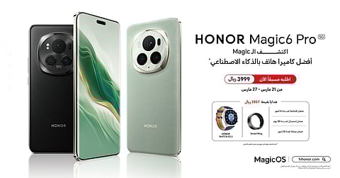 يتوفر HONOR Magic6 Pro للطلب المسبق باللونين الأسود والأخضر مقابل 3999 ريال. عند الشراء، سيحصل المستهلكون على هدايا مجانية بقيمة 2857 ريال، تتضمن Smart Ring، وساعة HONOR Watch GS 3 وHONOR Care+ والمزيد.