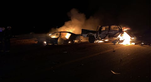 والتقت المركبتان وجهًا لوجه، ونتج من ذلك احتراقهما، وكانت إحدى السيارتين من نوع BMW ، تحمل لوحات كويتية، تُوفِّي سائقها و3 نساء وخادمة وافدة.