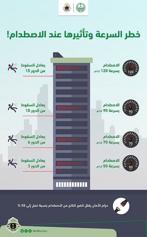 ونشر "المرور" على حسابه الرسمي في "تويتر" أنفوجرافيك يبين أمثلة عن خطر السرعة وتأثيرها عند الاصطدام، حيث إن الاصطدام بسرعة 120 كم في الساعة يعادل السقوط من الدور الخامس عشر، والاصطدام بسرعة 90 كم في الساعة يعادل السقوط من الدور العاشر، والاصطدام بسرعة 70 كم في الساعة يعادل السقوط من الدور السادس، والاصطدام بسرعة 50 كم في الساعة يعادل السقوط من الدور الثالث.