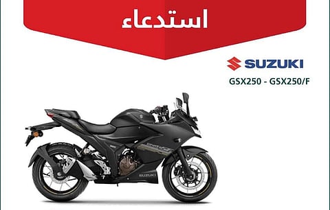 أعلنت وزارة التجارة عن استدعاء (1316) دراجة نارية من طراز سوزوكي (GSX250 - GSX250/F)، والمصنّعة خلال الأعوام 2022 – 2025، بسبب خلل في المكابح الخلفية (الكليبر) قد يؤدي إلى ضعف أداء عمل الفرامل، مما يزيد من احتمالية خطر وقوع حادث.