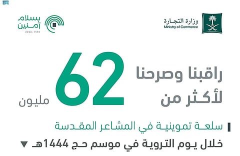 أعلنت وزارة التجارة تصعيد أكثر من 62 مليون سلعة غذائية لضيوف الرحمن في المشاعر المقدسة خلال يوم التروية اليوم الثامن من ذي الحجة 1444هــ.