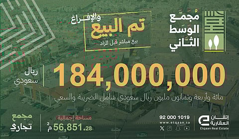 أعلنت شركة إتقان العقارية رائدة التسويق العقاري بالمملكة، نجاح بيع "مجمع الوسط التجاري الثاني" قبل بدء وانطلاق المزاد ضمن الجهود التسويقية الرائدة للشركة ونتيجة لكسب ثقة المستثمرين، حيث نجحت إتقان في تنفيذ عملية البيع المباشر للمجمع وبمبلغ بلغ 184 مليون ريال شامل السعي والضريبة والذي يمثل خيارات استثمارية متنوعة بقلب العاصمة الرياض، ضمن المنتجات العقارية المميزة التي طرحتها الشركة هذا العام.