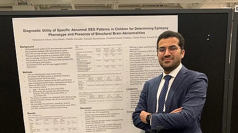 وأضاف أن البحث الأول أجري على 191 مريضاً، و98 طفلاً سليماً للمقارنة، حيث تم التوصل إلى علاقة بعض النتائج الشائعة لتخطيط الدماغ، وبعض أمراض الصرع، وكذلك علاقتها بنتائج الرنين المغناطيسي، وتعريف طبيب الأعصاب بالحالات التي تتطلب إجراء رنين مغناطيسي لاستبعاد بُعد الجلطات والمشكلات التكوينية في الدماغ، فيما كان البحث الثاني عن علاقة مرض تشوّهات الدماغ والمرتبط بالتحول الجيني PIK3CA وجلطات الأوعية الدموية بالدماغ لدى المواليد، وتوصل إلى الإسهام بتعريف الأطباء بضرورة استبعاد حالات جلطات الأوعية الدموية وعلاجها لدى المواليد المصابين بهذا المرض.