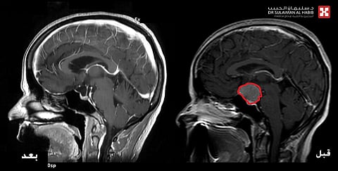 وقال الدكتور ديفيد: إنه تمّ إخضاع المراجعة لفحوصات بالرنين المغناطيسي "M.R.I"، وعدد من التحاليل المخبرية، مشيرًا إلى أنّ نتائج الفحوصات كشفت عن وجود ورم بقطر "3" سم، متمركز في قاع الجمجمة بمنتصف الدماغ، وضاغط بشدة على عصبَي البصر والغدة النخامية المسؤولة عن الهرمونات بالجسم، وعقب مراجعة كافة الفحوصات قرّر الفريقُ الطبي التدخلَ الجراحي العاجل لاستئصال الورم؛ للحيلولة دون إصابة المريضة بمزيد من المضاعفات الخطيرة أبرزها فقدان البصر بشكل كامل، بالإضافة إلى ازدياد حدة الأعراض وحدوث خلل بهرمونات الجسم.