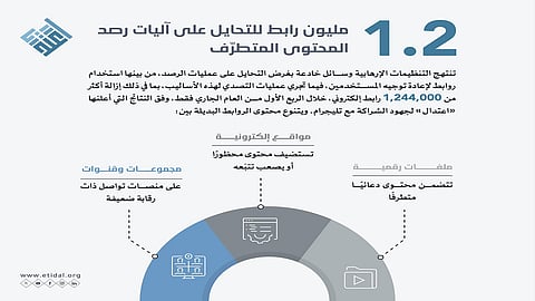 وذكر (اعتدال) في منشورٍ له عبر حسابه الرسمي على منصة (إكس)، أن التنظيمات الإرهابية تنتهج وسائل خادعة بغرض التحايل على عمليات الرصد، من بينها استخدام روابط لإعادة توجيه المستخدمين، فيما تجري عمليات التصدّي لهذه الأساليب، بما في ذلك إزالة أكثر من 1,244,000 رابط إلكتروني، خلال الربع الأول من العام الجاري فقط، وفق النتائج التي أعلنها (اعتدال) لجهود الشراكة مع منصة (تليجرام). ويتنوّع محتوى الروابط البديلة بين: