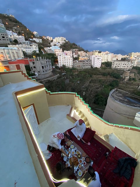 وعلى سطوح منازلهم والواقعة في أحضان الطبيعة، ومن أمام منازلهم وشرفاتها، وفي أفنيتهم وداخل مزارعهم؛ يفرش الأهالي سُفرهم الرمضانية المحتوية على الأطباق والمليئة بالأصناف الشعبية، كخبز الميفا واللحم المقدد والعصيد والمرق، والمتضمنة ما تنتجه مزارعهم من فواكه وخضروات طازجة.