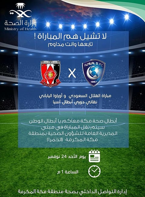 وتفصيلاً، تلقى عدد من موظفي صحة مكة المكرمة رسالة عبر إيميلاتهم من إدارة التواصل الداخلي بصحة مكة المكرمة، جاء فيها: "لا تشيل هم المباراة تابعها وأنت مداوم، أبطال صحة مكة معاكم يا أبطال الوطن. سيتم نقل المباراة في مبنى المديرية العامة للشؤون الصحية بمنطقة مكة المكرمة – الحمراء".