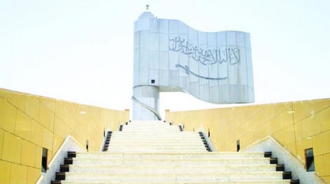 وقد شُيّد المبنى بطرازه المعماري على هضبة مرتفعة في أعلى نقطة من أبرق الرغامة ويحتضن مَعلمًا تذكاريًّا عبارة عن مجسم عليه عَلَم المملكة وفي داخله مصعد ويحرك العلم بشكل دائري عن طريق "الهيدروليك".