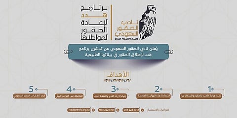 أطلق نادي الصقور السعودي، اليوم، برنامج "هدد" لإعادة الصقور إلى مواطنها، الذي يعد الأول من نوعه على مستوى المملكة العربية السعودية، ويهدف إلى تعزيز دور المملكة الريادي في حماية البيئة والحياة الفطرية، من خلال الحفاظ على سلالة الصقور وإعادتها إلى مواطنها الأصلية.
