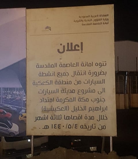 وتضمّن الإعلان حينها، نقلَ الورش بمنطقة الكعكية إلى مدينة السيارات جنوب مكة المكرمة امتداد طريق إبراهيم الخليل "العكيشية"، خلال مدة أقصاها ثلاثة أشهر من تاريخ الإعلان 4/ 5/ 1440، قبل أن تصرّح الأمانة بعد انقضاء المهلة الأولى، بتمديد مهلة جديدة في 30 ذي الحجة من العام الماضي؛ وهو الموعد الآخر الذي لم يتم العمل به.