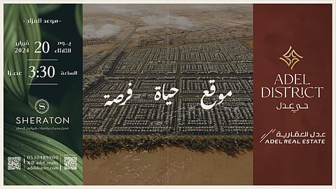 أعلنت "عدل العقارية" الشركة العقارية الرائدة في المنطقة الشرقية والمملكة؛ عن طرح مخططها النوعي متعدد الاستخدامات "حي عدل" للبيع في مزاد علني يُقام في فندق ومركز مؤتمرات شيراتون الدمام يوم الثلاثاء 20 فبراير 2024م عند الساعة 3.30 عصرًا.