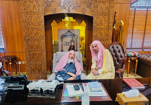 استقبل سماحة المفتي العام للمملكة العربية السعودية، الشيخ عبدالعزيز بن عبدالله آل الشيخ، في مكتبه أمس الأربعاء فضيلة الشيخ الدكتور أحمد الرضيمان، المفوض بالإفتاء بمنطقة حائل، واستمع منه إلى ما تضمنه العرض الشامل لمناشط الإفتاء بمنطقة حائل، وأبدى سماحته سروره بنشاط الفرع في خدمة المواطنين والمقيمين في مجال الإفتاء والبرامج العلمية.