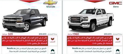 أعلنت وزارة التجارة عن استدعاء 2.280 مركبة Sierra" GMC" وشيفروليه "Silverado" سنة الصنع 2015 - 2016؛ وذلك لخلل في نافخ الوسائد الهوائية الستائرية قد يؤدي إلى انفصال الأجزاء الداخلية للمركبة، مما يزيد من خطر الإصابة حال وقوع حادث.