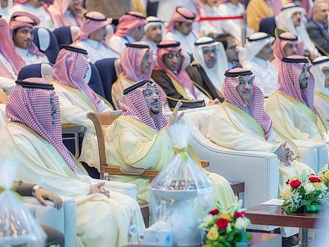 وشهد الأميرُ الحفلَ الخطابي المُعَد بهذه المناسبة، تخلله مسيرة الخريجين الذين يبلغ عددهم ٤٦٢، يمثلون ١٤ تخصصًا من أقسام الكلية، تلا ذلك تكريم سموه الكريم تقديرًا لرعايته الحفل.