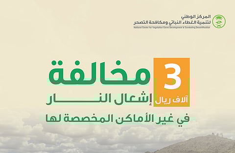 شدّد المركز الوطني لتنمية الغطاء النباتي ومكافحة التصحر على عدم مخالفة نظام البيئة بإشعال النار في غير الأماكن المخصصة لها، أو بغير الوسائل المسموح بها؛ لافتاً إلى أن مخالفة ذلك تُعرّض المخالف لغرامة مالية تصل إلى 3 آلاف ريال.
