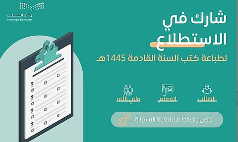 دعت وزارة التعليم الطلاب والمعلمين وأولياء الأمور للمشاركة في استطلاع حول طباعة الكتب الدراسية للسنة القادمة 1445 هجرية.