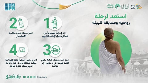 ووجهت الوزارة خلال حملتها التوعوية "إنها طاهرة" التي تشرف عليها مبادرة التوعية البيئية؛ حجاج بيت الله الحرام إلى اتخاذ بعض الخطوات المهمة قبل بدء رحلتهم الإيمانية؛ تعزيزًا للسلوكيات البيئية الإيجابية أثناء موسم الحج، ومن أهم تلك التوجيهات، ارتداء الحجاج إحرامات مصنوعة من أقمشة قابلة لإعادة التدوير؛ ليسهل التخلص منها بعد أداء الشعيرة، دون أن تؤثر على نظافة البيئة، إلى جانب الحرص على استخدام عبوات مياه الشرب متكررة الاستعمال؛ حتى لا يتسبب رمي عبوات المياه البلاستيكية في تراكم النفايات، بالإضافة إلى حرص الحجاج على ارتداء أحذية ذات جودة عالية تستمر معهم لفترات طويلة أثناء تحركاتهم، دون أن يصيبها التلف وتتحول إلى نفايات تؤثر على البيئة.