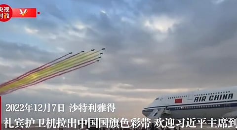 وأعرب السفير الصيني عن شكره على حسن استضافة المملكة للرئيس شي جينبينغ، ونشر مقطع فيديو للوحة التي رسمها الطيارون السعوديون للعلم الصيني.