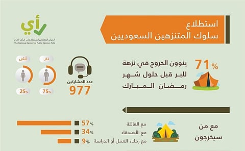 وتكونت العينة من 977 مواطنًا ومواطنة، 75% منهم من الذكور؛ إذ أفصح 71% منهم عن نيتهم الخروج في نزهة.