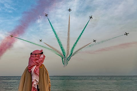 ضمن احتفالات المملكة بيوم التأسيس زيّن فريق "صقور السعودية"، سماء مدينة الجبيل أمس، بعروضٍ جوية مبهرة.