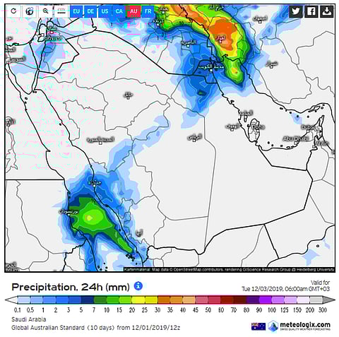 وقال عبر حسابه في "تويتر": الحالة المطرية الحالية متوقع أن تؤثر بأمطارها المتفرقة في أجزاءٍ من مناطق: #مكة المكرّمة وجنوب #المدينة المنورة، وأجزاءٍ من شمال #الرياض و#الشرقية وأجزاءٍ من #القصيم #عسير #الباحة #جازان و#الكويت.