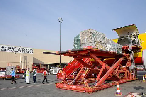 غادرت مطار الملك خالد الدولي بالرياض، اليوم، الطائرة الإغاثية السعودية الخامسة متجهة إلى مطار العريش الدولي بجمهورية مصر العربية؛ تمهيداً لنقلها إلى المتضررين داخل قطاع غزة، حيث تحمل على متنها مساعدات إغاثية متنوعة شملت مواد غذائية وإيوائية تزن 35 طناً، وذلك ضمن الحملة الشعبية لإغاثة الشعب الفلسطيني الشقيق في قطاع غزة، والتي وجّه بها خادم الحرمين الشريفين الملك سلمان بن عبدالعزيز آل سعود، وصاحب السمو الملكي الأمير محمد بن سلمان بن عبدالعزيز ولي العهد رئيس مجلس الوزراء -حفظهما الله-.