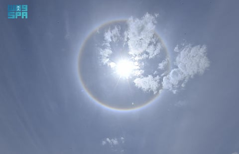 وأشار الباحث والمهتم بالتقويم الزراعي في منطقة عسير الدكتور عبدالله آل موسى؛ إلى أن الظاهرة البصرية تحدث عندما تتراصف بلورات الجليد بزاوية 22 درجة؛ ليُحدث هذا الانعكاس والانكسار البديع حلقة كبيرة من الضوء حول الشمس، وذلك نتيجة وجود سحبٍ عالية تحتوي على بلورات جليدية صغيرة؛ قد تترافق معه ألوان قوس قزح بسبب تحليل الضوء.
