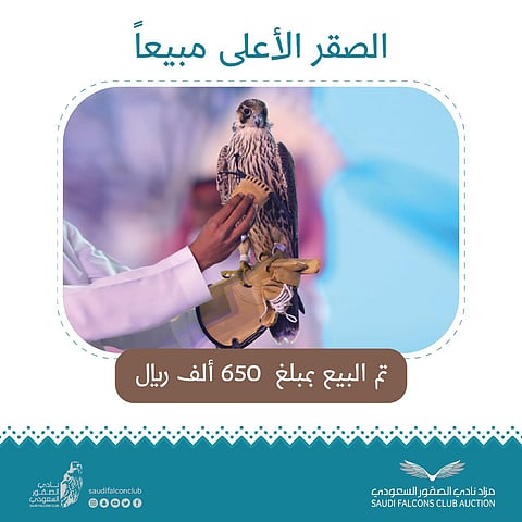 تصدّر مزاد نادي الصقور السعودي حديث المجالس، لاسيما الصقارين والمهتمين بهذا المجال، بعد أن حقق اليوم الخامس من المزاد مبيعات بلغت نحو مليون ريال، منها 650 ألف ريال لصقر شاهين فرخ، قادم من ظهرة حفر الباطن، في صفقة قياسية وصفت بالأعلى تاريخياً لشاهين فرخ، والأعلى حتى الآن في مزاد النادي، الذي يستمر حتى 15 نوفمبر المقبل.