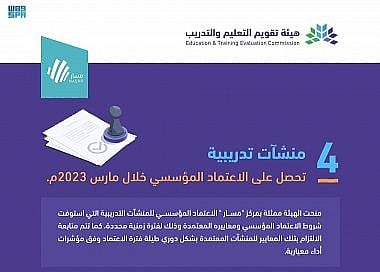 أعلنت هيئة تقويم التعليم والتدريب، ممثلة بالمركز الوطني لتقويم واعتماد التدريب "مسار"، حصول 4 منشآت تدريبية على الاعتماد المؤسسي خلال شهر مارس 2023م.