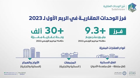 سجل برنامج "فرز الوحدات العقارية" خلال الربع الأول لعام 2023 م ارتفاعاً في عدد الأمتار المفروزة، حيث تجاوزت 9.3 ملايين م2 وذلك لما يزيد عن 30 ألف وحدة عقارية