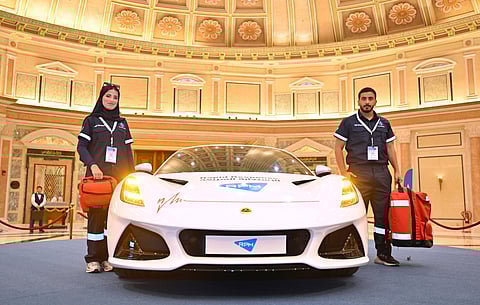 السيارة الجديدة من طراز LOTUS Emira First Edition الرياضية، بريطانية الصنع (بمواصفات الخليج)، وتُعد من السيارات النادرة التي جرى تعديلها طبيًا لتلائم مهام الاستجابة الطارئة. ويتيح لها بلوغ سرعة تصل إلى أكثر من 300 كيلومترًا في الساعة، ما يجعلها من أسرع مركبات الطوارئ الطبية في العالم.