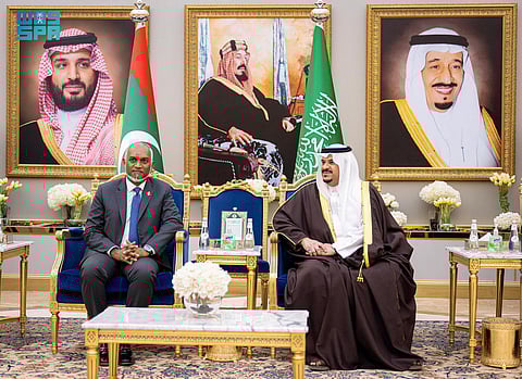 وكان في استقباله في مطار الملك خالد الدولي، الأمير محمد بن عبدالرحمن بن عبدالعزيز نائب أمير منطقة الرياض، وسفير خادم الحرمين الشريفين لدى جمهورية المالديف مترك بن عبدالله العجالين، وسفير المالديف لدى المملكة أحمد سرير، ومدير شرطة المنطقة المكلف اللواء منصور بن ناصر العتيبي، ووكيل المراسم الملكية فهد الصهيل.