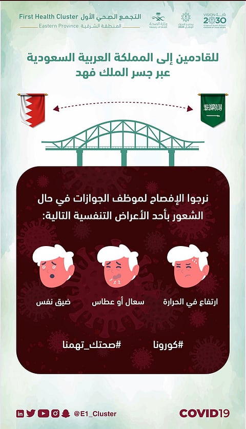 طالبت إدارة التجمع الصحي الأول بالمنطقة الشرقية عموم المسافرين القادمين من مملكة البحرين عبر جسر الملك فهد، بالإفصاح لموظف الجوازات في حال الشعور بأحد الأعراض التنفسية مثل: سعال، عطاس، الحرارة، ضيق التنفس.