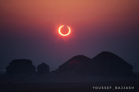 وتابع: طلعت الشمس في حالة كسوف، وتقريباً بعد 12 دقيقة من شروق الشمس أي عند الساعة 6:36 ص، إذ كانت الشمس في نقطة الاكتمال لكسوف الشمس الحلقي وظهرت وكأنها حلقة نارية.
