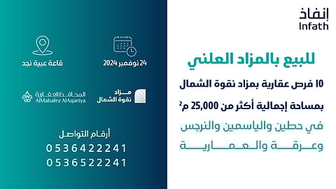 تعلن شركة المحافظ العقارية وبإشراف مركز الإسناد والتصفية «إنفاذ» وبقرار من محكمة التنفيذ، عن إقامة مزاد "نقوة الشمال" في قاعة عبية نجد يوم الأحد 22 جمادى الأولى 1446 هـ الموافق 24 نوفمبر 2024 م الساعة 4 مساءً.