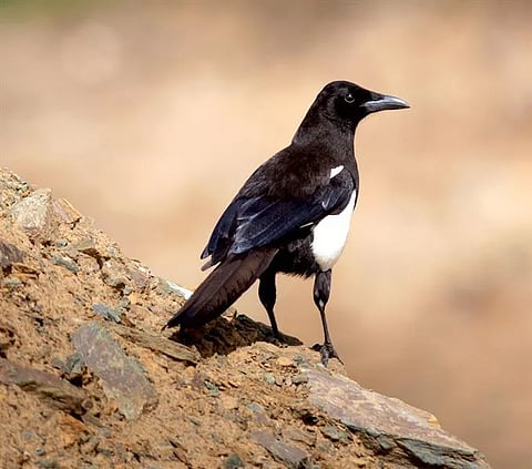 ولفت المركز إلى أن الطائر لونه أسود داكن ذو بطن أبيض يبلغ طوله نحو 46 سم ووزنه 240 جرامًا، وهو النوع الوحيد من فصيلة العقعق التي تستوطن المملكة دون غيرها ويوجد في جبال عسير.