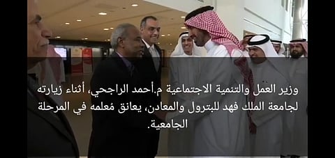 عانق وزير العمل والتنمية الاجتماعية أحمد الراجحي معلمه في المرحلة الجامعية، وذلك عقب أن صادفه خلال زيارة الوزير لجامعة الملك فهد للبترول والمعادن.