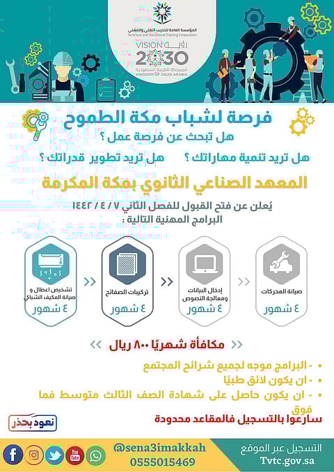 أعلن المعهد الصناعي الثانوي بمكة المكرمة، عن فتح باب القبول والتسجيل واستقبال طلبات المتقدمين لدبلوم السيارات لخريجي الصف الأول أو الثاني الثانوي؛ حيث المدة سنتان يمكن للخريج بعدهما أن يكمل تدريبه بالكليات التقنية بعد ذلك.