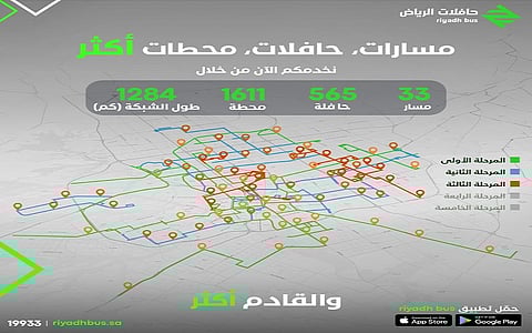 ولفت المشروع في فيديوجراف على حسابه بمنصة "إكس" إلى أن المرحلة الثالثة تشمل 33 مسارًا لـ 565 حافلة عبر 1611 محطة بطول شبكة يبلغ 1284 كم، وتتبقى المرحلتان الرابعة والخامسة للوصول لجميع أنحاء الرياض.