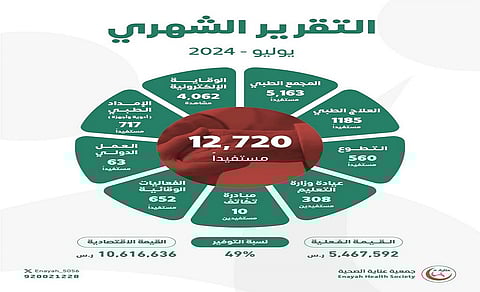 وفي التفاصيل، صرّح الأمين العام للجمعية الدكتور سلمان بن عبدالله المطيري، بأن جمعية "عناية" قدّمت خدماتها الصحية خلال شهر يوليو 2024، لـ12.720 مستفيدًا؛ مشيرة إلى أن القيمة الاقتصادية لهذه الخدمات بلغت 10.616.636 ريالًا سعوديًّا.