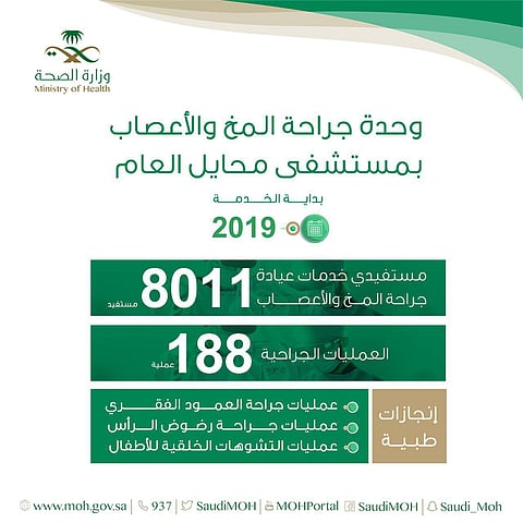 نجحت وحدة جراحة المخ والأعصاب بمستشفى محايل العام، في تقديم خدماتها لـ8011 مستفيداً، منذ بدء العمل بالوحدة في يناير 2019، وحتى تاريخه.