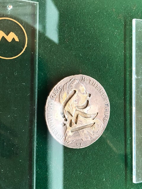 وفي صندوق زجاجي لا يستطيع الزائر فتحه تشاهد "الريال الفرنسي" الذي يسميه العامة في ذلك الحين بـ "الفرآنصي" أو "أبو شوشة" نسبة لشعر الرأس الكثيف للإمبراطورة النمساوية "ماريا تيريزا"، وهي تنظر نحو اليمين، وكان الأجداد لا يفرقون بين نوع الجنس في الصورة، ويحيط بالصورة اسم الإمبراطورة بحروف لاتينية، أما الظهر فهو يحمل شعار الإمبراطورية، وهو عبارة عن نسر برأسين وبدن يشبه النافذة، وذلك الشبه أدّى بكثير من الناس إلى إطلاق اسم عامي مرادف للنافذة التي على تلك العملة؛ إذ عرفت أيضاً باسم آخر هو "أبو طاقة"، وتحيط برسم النسر الإمبراطوري كتابات لاتينية.