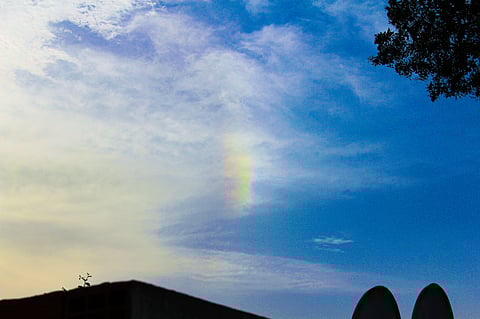 قال رئيس الجمعية الفلكية بجدة المهندس ماجد أبوزاهرة إن فصل الشتاء يشهد عدة ظواهر جوية بصرية تشاهد في السماء تشمل لطخة من الضوء بلون قوس قزح على جانبي الشمس تسمى "الشمس الوهمية"، كما يظهر في الصورة بسماء السعودية في مدينة جدة.