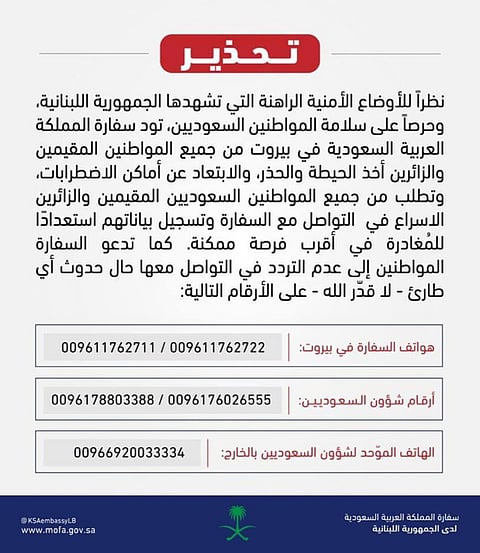 دعت سفارة المملكة العربية السعودية في لبنان، جميعَ المواطنين السعوديين المقيمين والزائرين، إلى الإسراع في التواصل مع السفارة وتسجيل بياناتهم؛ استعدادًا لمغادرة لبنان في أقرب فرصة ممكنة؛ وذلك نظرًا للأوضاع الأمنية الراهنة التي تشهدها الجمهورية اللبنانية.