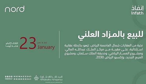 تعلن شركة المحافظ العقارية – وكيل البيع القضائي – عن مزاد "نورد الشمال" العلني تحت إشراف مركز الإسناد والتصفية "إنفاذ" وبقرار من محكمة التنفيذ وبحكم من الأحوال الشخصية، والذي يقام في قاعة أروما بحي الياسمين بمدينة الرياض يوم الثلاثاء 11 رجب 1445هـ الموافق 23 يناير 2024م.