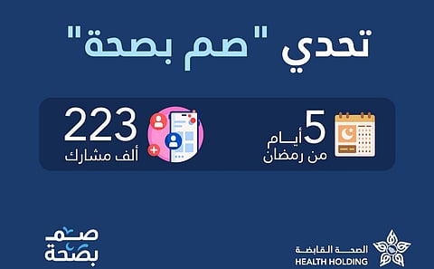 وتأتي حملة "صم بصحة" في إطار الجهود المبذولة لتعزيز ثقافة الحياة الصحية خلال الشهر الفضيل من خلال إجراء الفحص الصحي الدوري باقة "صم بصحة"، والتي تتضمن 8 فحوصات مخبرية، والتعريف بالخدمات المتنوعة المقدمة عبر مراكز الرعاية الأولية، وتشجيع المواطنين والمقيمين على المشي اليومي بما لا يقل عن 8 آلاف خطوة، والنوم الكافي لمدة 8 ساعات باليوم.