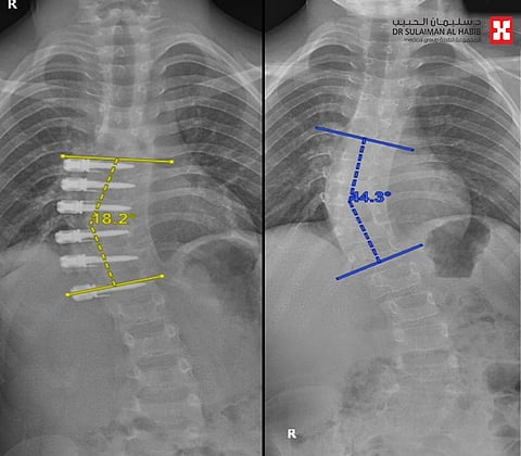 وقال رئيس الفريق الطبي المعالج د.سلطان السالمي إنه مع إصابة الطفل بالتوحد تَعَذر التعامل مع حالته بالدعامات والحزام الطبي؛ فضلًا عن أن تزايد درجة الانحراف ووصولها إلى 45 وكون المريض ما زال في مرحلة النمو؛ دفعت الفريق الطبي إلى البحث عن خطة علاجية تستصحب كل هذه المعطيات، وبالفعل أُخضِع المريض لعملية متقدمة تسمى بـ"شد العمود الفقري"، وجرت باستخدام المنظار بمساعدة الدكتور زياد الغامدي من جراحة الصدر، وكذلك استخدام جهاز الملاحة العصبية وتخطيط الأعصاب، وتم فيها تعديل درجة الانحراف باستخدام مسامير وحبل جانبي، مع الإبقاء على مرونة العمود الفقري؛ بهدف توجيه وتقويم النمو ليتم التعديل بشكل تلقائي، وتُعَد العملية الأولى من نوعها بالشرق الأوسط.