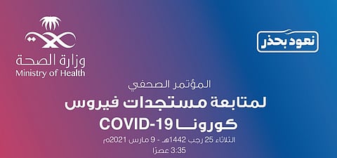 تعقد وزارة الصحة المؤتمر الصحفي لمستجدات فيروس كورونا (كوفيد-19) اليوم الثلاثاء 25 رجب الموافق 9 مارس 2021 عند الساعة 3:35 عصرًا.